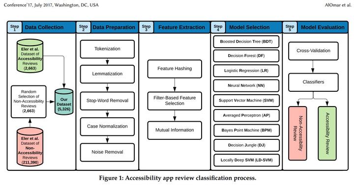 In recent years, mobile accessibility has become an important trend with the goal of allowing all users the possibility of using any app without many limitations. User reviews include insights that are useful for app evolution. However, with the increase in the amount of received reviews, manually analyzing them is tedious and time-consuming, especially when searching for accessibility reviews. The goal of this paper is to support the automated identification of accessibility in user reviews, to help technology professionals in prioritizing their handling, and thus, creating more inclusive apps. Particularly, we design a model that takes as input accessibility user reviews, learns their keyword-based features, in order to make a binary decision, for a given review, on whether it is about accessibility or not. The model is evaluated using a total of 5,326 mobile app reviews. The findings show that (1) our model can accurately identify accessibility reviews, outperforming two baselines, namely keyword-based detector and a random classifier; (2) our model achieves an accuracy of 85% with relatively small training dataset; however, the accuracy improves as we increase the size of the training dataset.